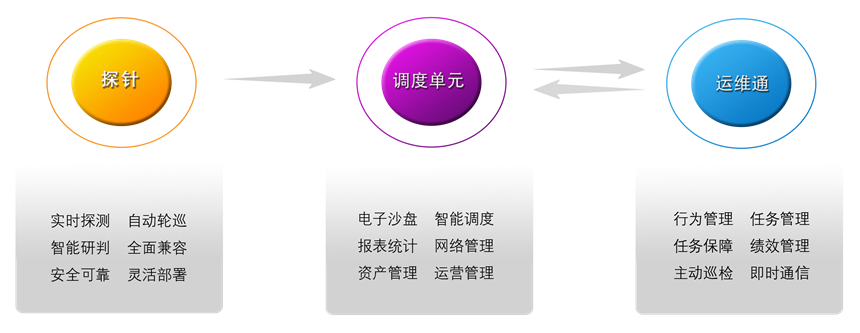 通过引入使用数学建模技术、多维算法技术、计算机智能视觉技术等,打造出一套集故障即时发现、故障精准定位、成像质量分析、实时调度、动态资产平衡、自定义报表以及全自动主动巡检、派单等众多功能于一身的“视频运维安全管理系统”,实现了对视频监控系统健康运行全生命周期的精准管理。“视频运维安全管理系统”通过灵活构建包括全面兼容的探针系统、支持多种智能算法的调度单元以及高效便捷的移动终端系统,利用光纤单向传导物理属性和UDP协议单向指令推送,实现物理机隔离。可全面支持各种监控系统日常运维的一般要求,更能提供丰富的定制和增值功能,满足未来全面智能、自动高效的各种运维需求。