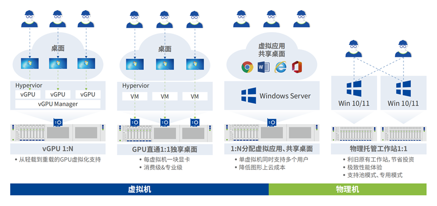 GPU 资源池化、可视化:通过 vGPU 实现显卡资源池化,同时实现显卡资源及 GPU 授权在云桌面关机后自动释放,实现多用户共享 GPU 资源,提升资源利用率。